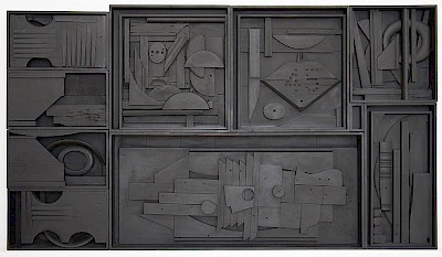 Louise Nevelson (Pereiaslav, Ukraine (formerly Russian Empire), 1899 - 1988, New York, New York), Tide Garden IV, 1964, painted and assembled wood construction, 91 x 140 x 10 in., Arkansas Museum of Fine Arts Foundation Collection: Gift of Sidney Singer, Sr., Stephens Inc., Gerald Cramer, Martin Oppenheimer, Edward Rosenthal, and John Rosenthal. 1983.030.