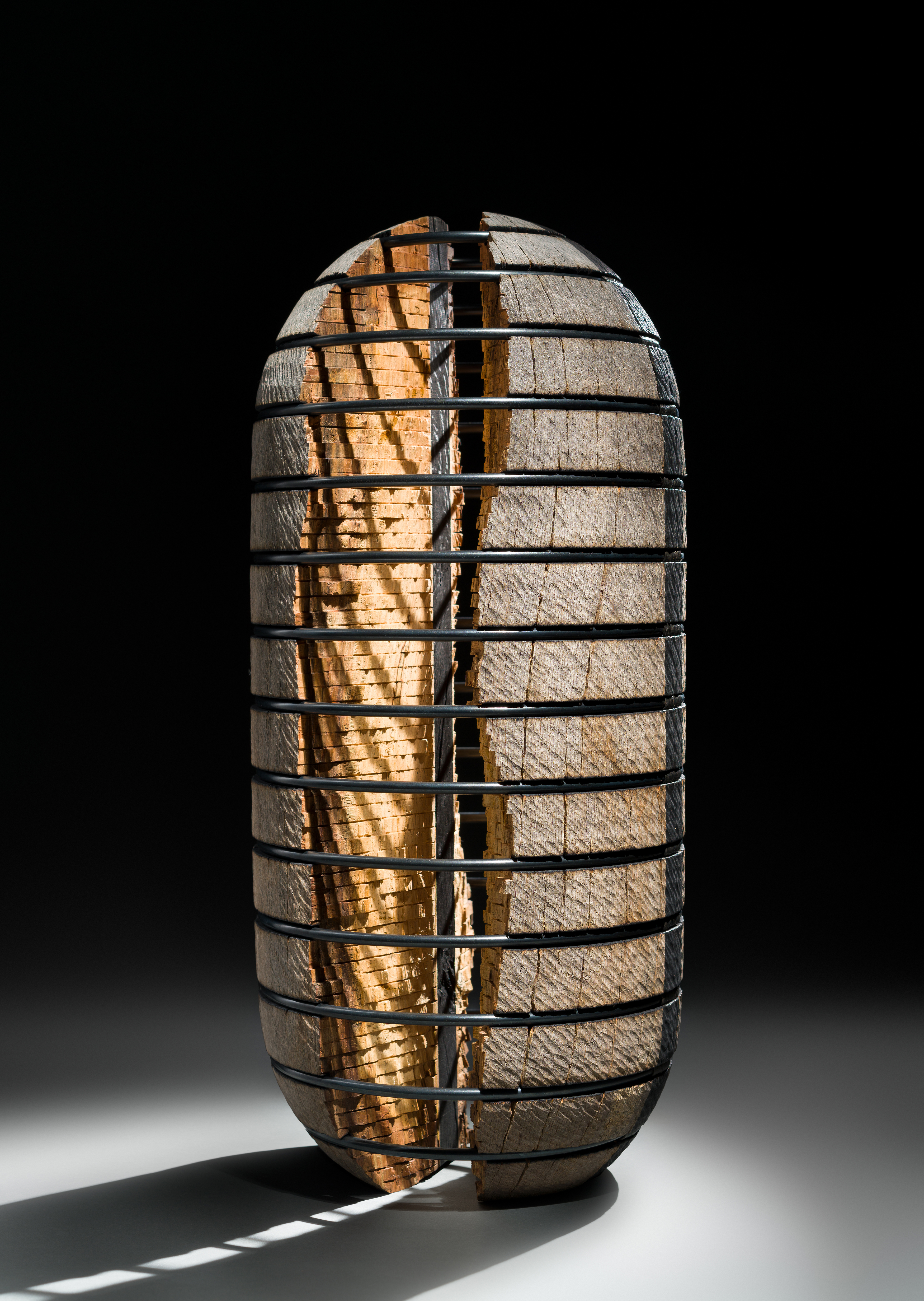 Todd HoyerTodd Hoyer (Beaverdam, Wisconsin, 1952 - ), Untitled (Suspended Series), 2021, Mexican blue oak and steel, lathe-turned, weathered, carved, burned, inked, and blued steel, 20 3/4 x 9 x 9 in., Arkansas Museum of Fine Arts Foundation Collection: Purchased with a gift from John and Robyn Horn. Photography by Edward C. Robison III. 2021.004.001.